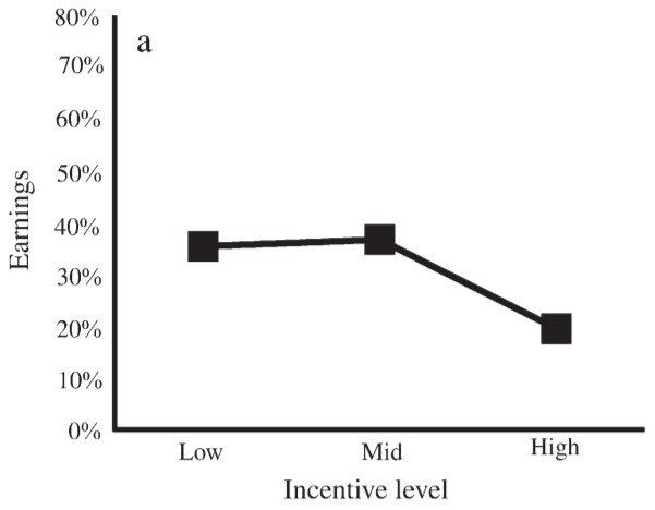 Ariely et al. (2009) provided experimental participants with financial incentives to undertake a series of tasks that required creativity, concentration, memory and problem solving skills. Some participants could earn a bonus equivalent to about one day’s pay. Others could earn a medium sized bonus equivalent to about two weeks pay. And a third group could earn a bonus worth around five months of their regular pay. (The experiment was done in rural India, so although the amounts were relatively large for the participants, they did not break the experimental budget.)