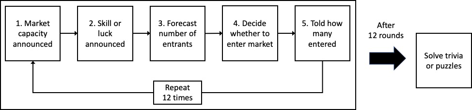 In each round of the experiment, the market capacity was announced to the players, along with whether the payoffs in the market were based on luck or skill. The participants were then asked to forecast the expected number of entrants (for which they earn a payment if correct) and decide simultaneously and without communicating whether to enter into the market. Subjects were then told how many participants had entered.